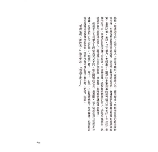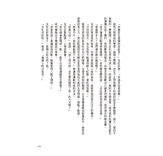 她辦到了。倫敦從不像克拉拉想像中那麼完美,但她找回了自己的力氣,只可惜找不回她的熱情。她通過考試,也寫了論文,送出求職信。而在一個鼎鼎大名、備受尊重、放眼全世界的政治家伊娃卡琳‧柏曼說她想要親自面試她時,克拉拉的熱情終於回來,身邊將是各種難以想像的高風險政策、重要決策、金錢,以及權力,太刺激了。跟伊娃卡琳共事的前六個月非常美好。克拉拉任老闆予取予求,周遭的世界充滿了有擔當、有音樂品味,頭髮修剪整齊的男人。若是早幾個月,她絕對不會注意到這些男人。跟這些人交手很刺激、很有趣,有時甚至讓她身體熱起來。但發生在希利爾身上的情況完全不同。雖然開頭同樣是一場遊戲,如今卻感受到自己在失控邊緣。也許她早已失去自制力。她撫平裙子,嘆了一口氣。她不自覺地想起了馬哈穆德,也許是因為那封將近兩個禮拜前收到,但並沒有回覆的電子郵件吧。她搖了搖頭。
