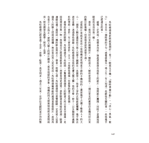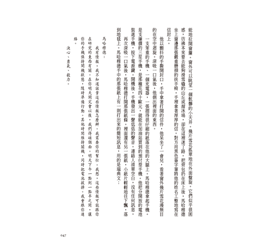 他藏在柱子後面,把電池放進手機裡。站在這裡,倘若有人走樓梯上來的話,可以看得一清二楚。他感覺脈搏加快、喉嚨緊縮。這個月台,這場雨,眼前所有的一切都讓他覺得此刻更加確切,更加真實。某個角度來說,這樣很刺激。就像一場遊戲。