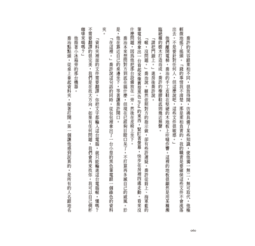 「資料夾裡面的文件需要翻譯。你把文字都輸入這台電腦,就只能輸進這台電腦喔,懂嗎?不需要翻譯到很完美,我們是在找大方向。如果有任何問題,我們會再來找你。我可以自己倒杯咖啡來喝嗎?」