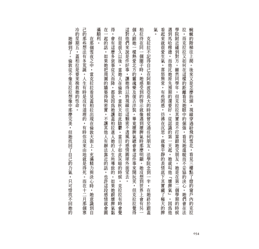 但是很久以後,當她人在倫敦,當秋天如此陰鬱,當日子如此灰暗的時候,克拉拉有時會覺得,會有這麼多衰事從天而降,都是因為她讓蓋柏拉進入她的人生所導致的。如果她跟壞脾氣黏在一起的話,如果她把周圍的牆築得夠密實,不讓其他人有辦法靠近的話,也許這段感情就會圓滿順利。