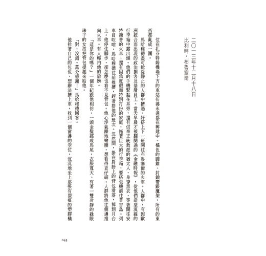 馬哈穆德在布魯塞爾地鐵站待了一個小時。他遵照電話裡的人所說的,不停地搭上前往不同方向的列車。抵達南站以後,搭手扶梯到一個空蕩的平台。一片低雲懸掛在布魯塞爾南方,此刻看起來宛如黃昏。毛毛細雨掃過有裂縫的混凝土牆面,景物都成了灰色,沉悶而枯燥。眼前唯一的色彩是軌道上的鏽痕,以及上方有遮蓋的、小小的月台候車處旁那些逐漸剝落的塗鴉。