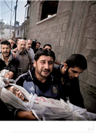 《加沙的葬禮》。一束初升的陽光經牆壁折射,意外地照亮了送葬者的臉和整個隊伍。遇難的孩童蘇赫卜以及她的哥哥穆罕默德被親人抱在懷裡,後面的人抬著他們父親屍體的殘骸。