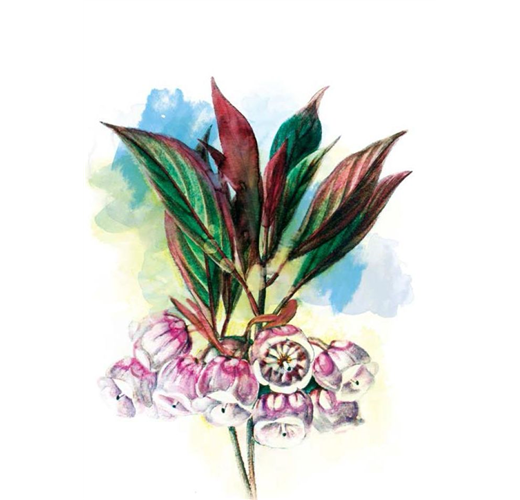 花通常三至八朵組成傘形花序,從枝頂覆瓦狀排列的紅色大苞片內生出,苞片呈長圓狀橢圓形;花萼五裂;花冠寬鐘狀,粉紅色或紅色,果梗直立,綠色,蒴果橢圓形,淡黃色,具五棱。