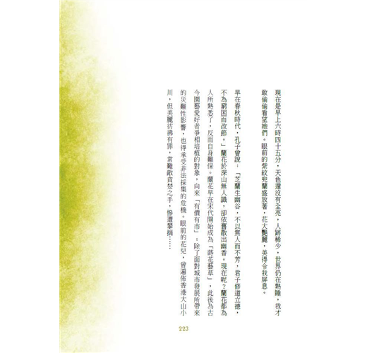 早在春秋時代,孔子曾說:「芝蘭生幽谷,不以無人而不芳,君子修道立德,不為窮困而改節。」蘭花於深山無人識,卻依舊散出幽香。現在呢?蘭花都為人所熟悉了,反而自身難保。蘭花早在宋代開始成為「蒔花藝草」,此後為古今園藝愛好者爭相培植的對象,向來「有價有市」;除了面對城市發展所帶來的災難性影響,也得承受非法採集的危機。眼前的花兒,曾遍佈香港大山小川,但美麗彷彿有罪,常難敵貪婪之手,慘遭攀摘……
