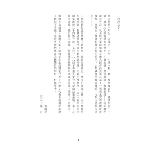 二氧化碳和溫室氣體不斷增加,導致全球暖化。林立的屏風大樓、永不關掉的空調系統、數量過多的汽車加劇熱島效應。天氣反覆無常,二○一五年全年平均氣溫達二十四點二度,是自一八八四年香港天文台有紀錄以來最暖一年。花期大紊亂,欖仁樹不落葉,假蘋婆與杜鵑誤以為身在春夏,竟在十二月開花。
