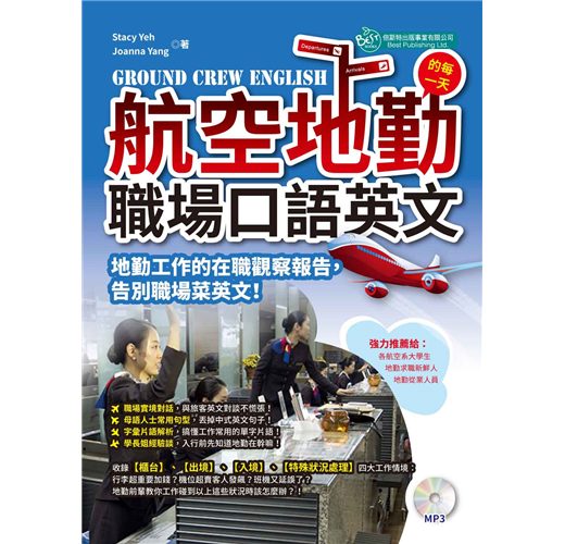 著重在地勤人員於工作中必定會使用到的英文,並列舉了各式各樣可能會遇到的問題,如:班機延誤、行李超重、飛機故障、颱風天班機取消、奧客刁難等,以及許多工作上必要的心態調適與基本認知。