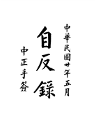 自反,意為自我反省。儒家學派提倡「自反」,蔣介石信奉儒學,一生努力踐行「自反」學說。他的日記,常多反省之詞,每週、每月、每年,常有《反省錄》之設。《孟子.公孫丑上》云:「自反而不縮,雖褐寬博,吾不惴焉?自反而縮,雖千萬人,吾往矣。」其中,「縮」,意為直,引申為有道理;「褐寬博」,指穿著粗布衣服的平民;「惴」,惴惴不安。全句大意為:自我反省,如果理虧不直,哪怕是面對普通平民,也會惴惴不安、猶疑不決;相反,如果自我反省,感覺符合道理,即使面對千軍萬馬,我也會勇往直前!一九三一年五月,蔣介石翻閱自己的舊存文稿,覺得所存不過十分之一,擔心日後事務愈繁,散佚的情況會更嚴重,便託自己童年的老師和後來的秘書毛思誠(勉廬)編輯付印。為此,他特別寫了篇序言,一開始就向自己提出問題:「自反而縮乎,自反而不縮乎?」意為,我多年來的所作所為,反省起來,是有道理呢?還是沒有道理呢?他要求毛思誠按照原樣編輯,「迂陋短拙,悉存其真」,作為此後「朝夕自反之資」,希望能對「寡過進德,略有裨助」。