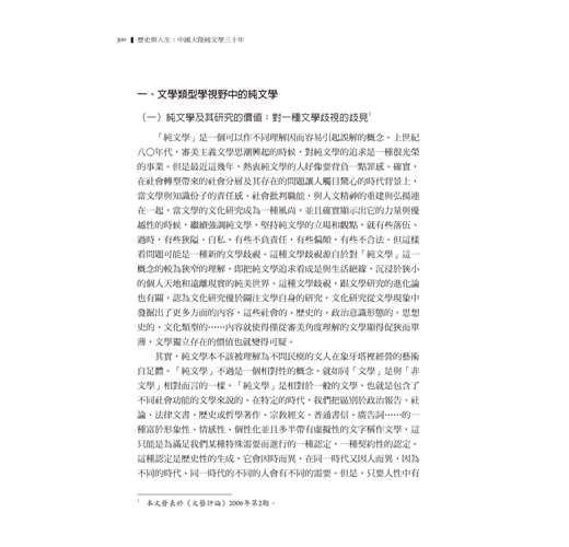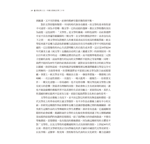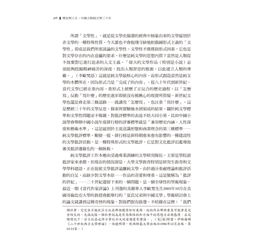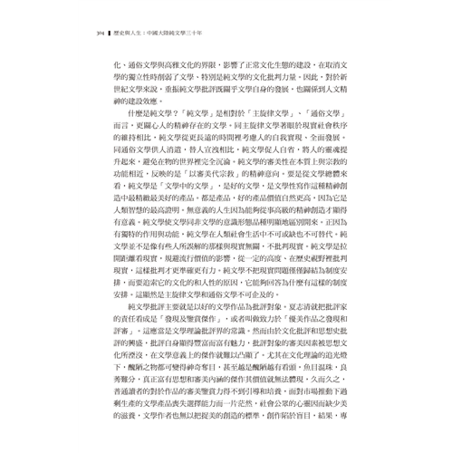 有三十幾年的創造歷程及成果積累的後毛澤東時代文學,其作品之浩繁與現象之紛紜,非個人之力所能把握,是故每個熱愛並從事近三十年大陸文學研究的學者,不能不有所選擇。我從上世紀八○年代起,選取從純文學視角對行進中的新時期文學進行考察與評析,多少受了夏志清先生學術思想的影響,以為做文學研究應該選擇傑作加以品評,這固然是八○年代審美主義文學思潮灌溉的結果,也是像我們這類五○後生人的文化宿命。從毛澤東時代走進後毛澤東時代,極權主義的陰影會持續制約文學從業者的思想旨趣,在文學研究的審美活動中無法不以歷史批判為中心意向。純文學區別於嚴肅文學的現實性和通俗文學的娛樂性,跟主流意識形態和流行的價值觀念能夠保持一定的距離,因而具有較大的反思歷史和拷問人性的自由空間。純文學要維護的是個人的權利、尊嚴和夢想,所以它天然地與危害這一切的社會現實相衝突,比嚴肅文學更有批判性。由純文學的特性所決定,純文學作家和研究者永遠站在社會惡和人性惡的對立面。所以,只要不把純文學誤解成逃避現實,重形式輕內容,就不難看出純文學研究者所堅持的人文主義思想立場。