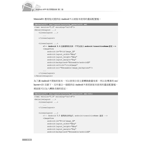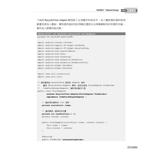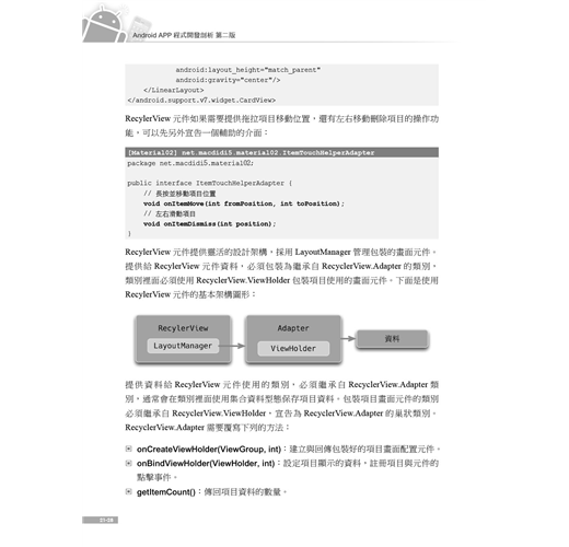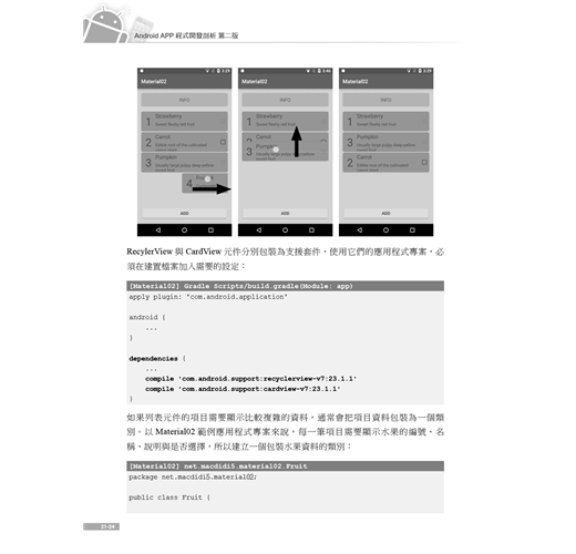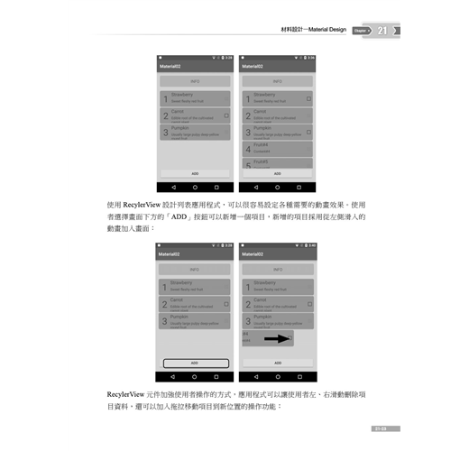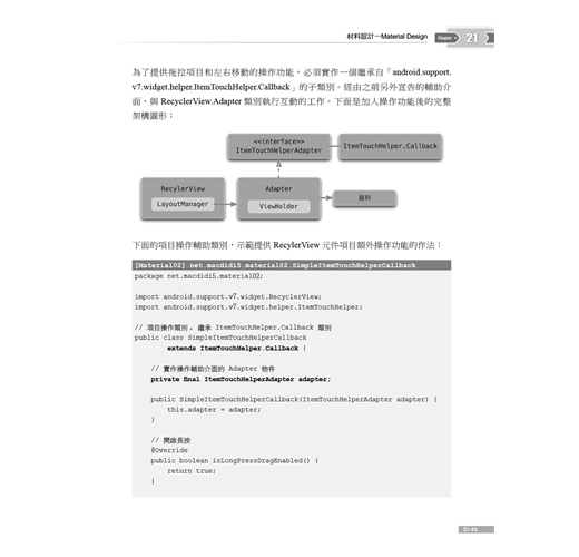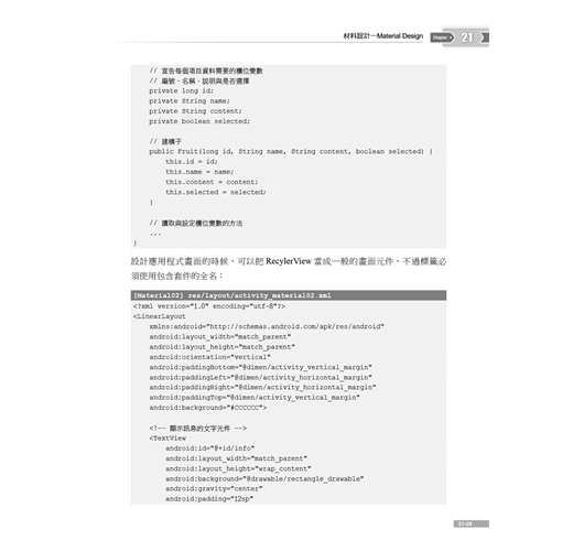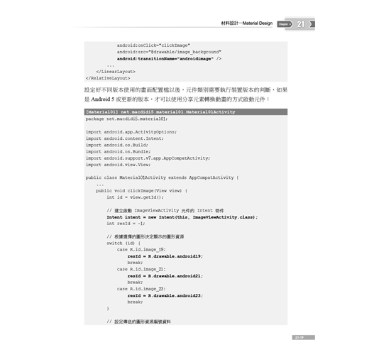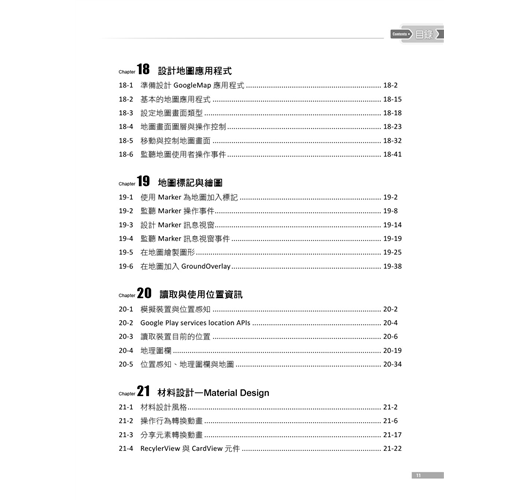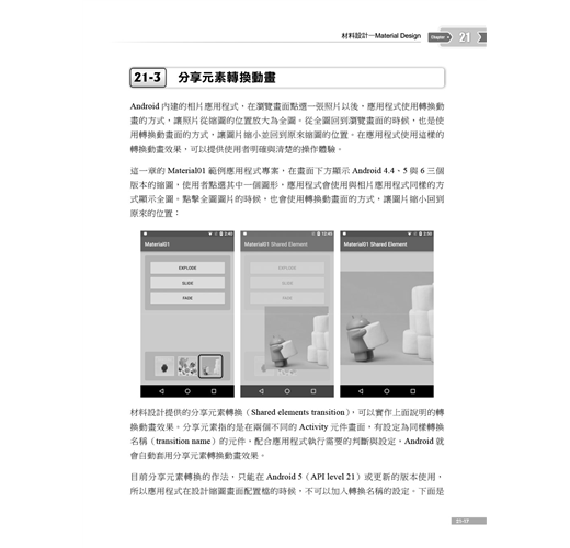 本章說明材料設計應用程式設計的部份,包含全新設計的材料設計風格(Material Design Theme),使用元件與畫面轉換效果的API,提供使用者全新的操作體驗。還有支援材料設計的RecylerView與CardView元件,提供更容易設計的列表與畫面元件。而使用材料設計API設計美觀與統一的應用程式畫面,提供完全不同的使用者體驗。