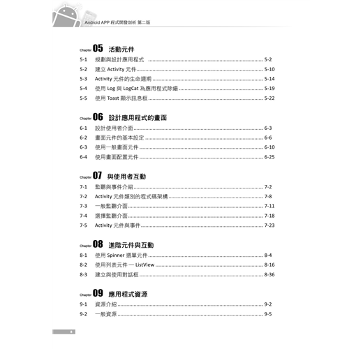 本章從Android應用程式基本的規劃與設計開始,介紹Activity元件的基本設計方式,並瞭解關於Activity元件的生命週期概念,這種生命週期的概念在一般Java應用程式中比較不會遇到,不過在Android應用程式中的元件,卻是開發人員一定要瞭解的設計方式。