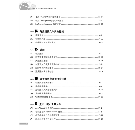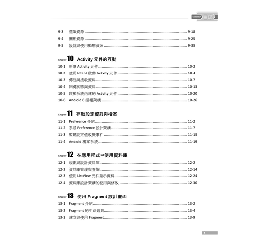 這一章介紹在Android 3.0加入的Fragment,說明需要使用這種設計方式的時機,Fragment特殊的設計方式和它的生命週期,還有如何在Activity元件中使用Fragment組合成需要的畫面。另外也會說明用來顯示列表資料與提供設定畫面的ListFragment和PreferenceFragment。