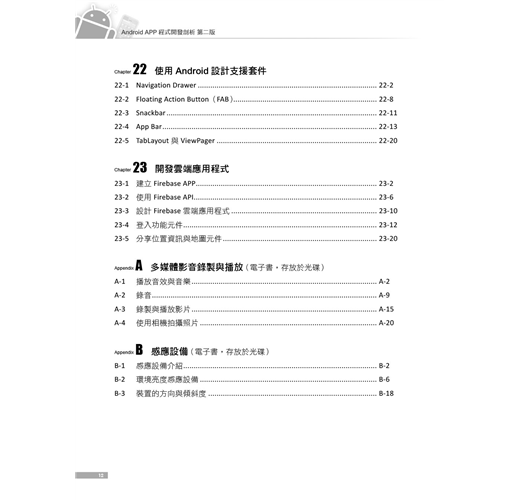 書本裡面說明的內容,不是單純的介紹Android API用法。提供的範例程式專案,也不是一些簡單的黑底白字(或是白底黑字)畫面。依照這本書的內容,在學習的過程參考說明的主題,和範例應用程式專案示範的應用,相信你的創意與想法都可以順利地套用到想要開發的應用程式。