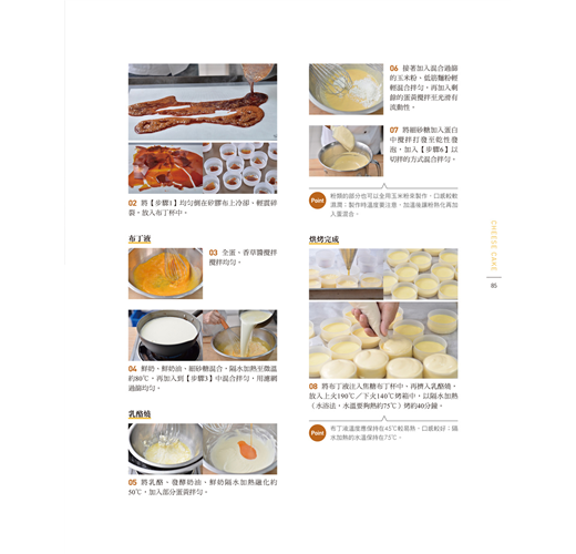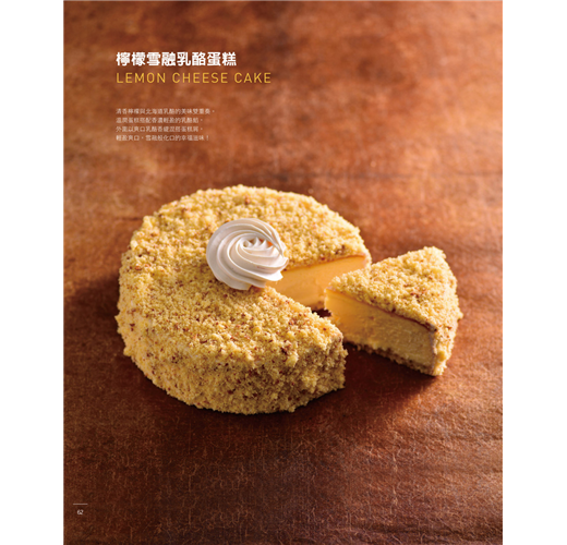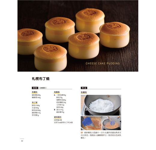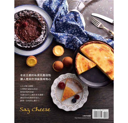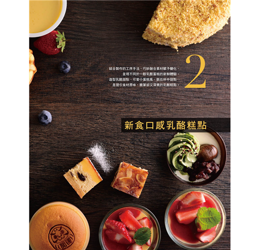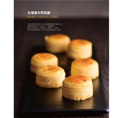 絕佳美味的乳酪甜點教作,含括時下當道的新主流:以溫度及時間的技法掌控,呈現乳酪豐潤滑嫩的半熟乳酪;同時品嚐到多層次口感滋味的乳酪布丁燒;輕盈蓬鬆、入口即化的舒芙蕾絹の乳酪等等。