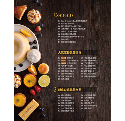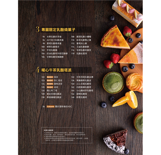 蛋糕、蛋糕卷、布丁燒、特色節慶糕點、酥塔餅乾,多樣化的乳酪甜點,結合精準的製作技術圖解示範,讓您一次學會最受歡迎的乳酪甜點,在家也能做出名店級美味。