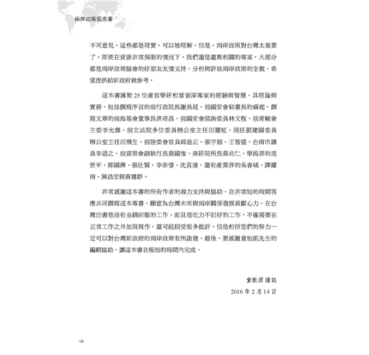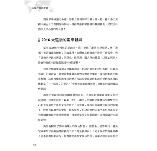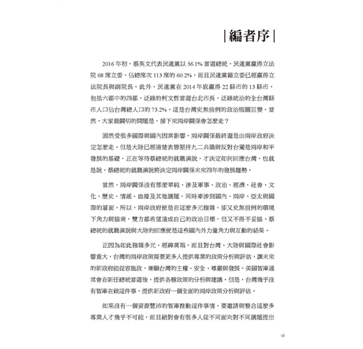 兩岸關係牽涉台灣發展與生存的命脈,卻史無前例、錯綜複雜。因此本書匯集了眾多產官學研先進的意見與想法,盱衡國內外總體情勢,提出整合性的兩岸戰略與政策建議,期盼建構兩岸互動新模式,並提供新政府作為兩岸政策的全面性思考。