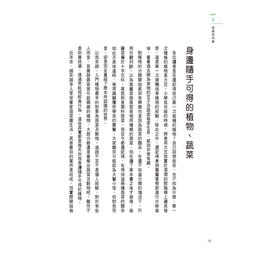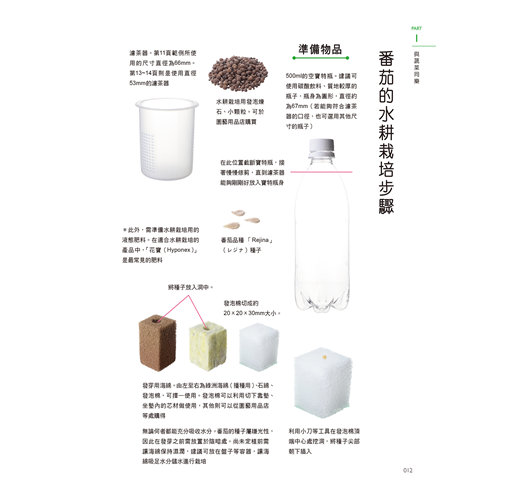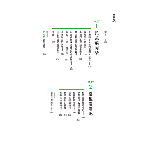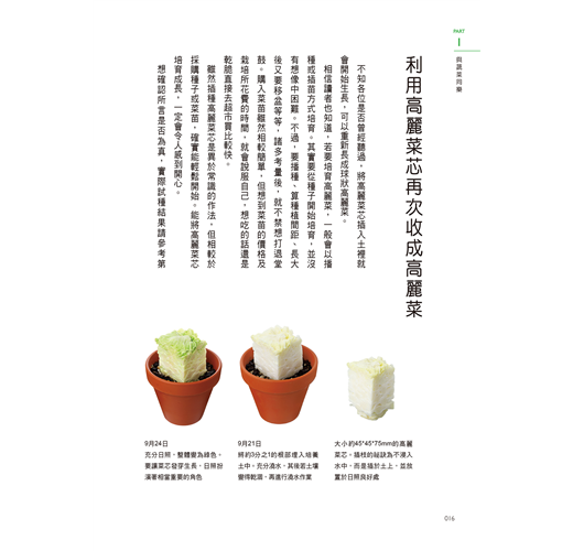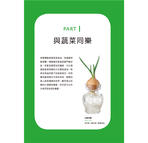 想要體驗看看蔬菜栽培,但總覺得要規劃一個像樣的家庭菜園門檻好高,有著這樣想法的讀者,可以透過與蔬菜同樂的方式開始栽培。將煮完菜後所剩下的蔬菜菜芯,利用寶特瓶等隨手可得的材料,輕鬆的進入蔬菜種植的世界。雖然是以玩樂的心情開始種植,但仍是可以充分地享受收成的樂趣。
