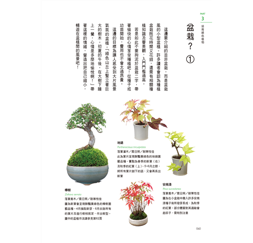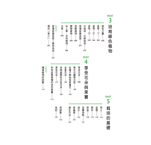 本書介紹超過200種的植物栽培法,皆可栽種於小型陽台或是屋內角落的植物,更因為撰寫這本書,作者花費一年的時間在陽台試種番茄、甘藷、高麗菜,更進行芒果及荔枝的播種,看著牽牛花開花,更於室內利用小型容器種植水草和苔蘚,以上皆為小型植物;上班族也不用沮喪,第三章收錄迷小盆栽風的小盆植和多肉植物的裝飾壁掛及照料法,透過手掌園藝體會生命成長的美好。