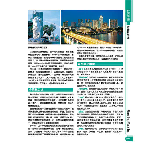2.新加坡熱點搶先曝光!2008年世界最高的摩天輪在新加坡新豋場,並首度舉辦F1賽車,公路賽、夜間賽一次來,刺激度百分百;2009年完成兩大豪華賭場度假中心,2010年濱海灣金沙開幕,徹底改變新加坡的城市風景線;2013年濱海市區線通車,深入新加坡西北部自然景觀。本書在手,讓你掌握魅力獅城最新娛樂脈動!