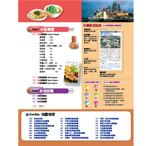 3.【分區導覽】將新加坡本島與各離島規劃成16個分區,以詳實的地圖,利用地鐵搭配步行的方式,邊走邊看邊玩邊吃,輕鬆暢遊各個經典熱門景點。【旅遊錦囊】提供最實用的旅遊實用資訊,包含交通、住宿等情報,是前往新加坡旅遊必備的工具書!