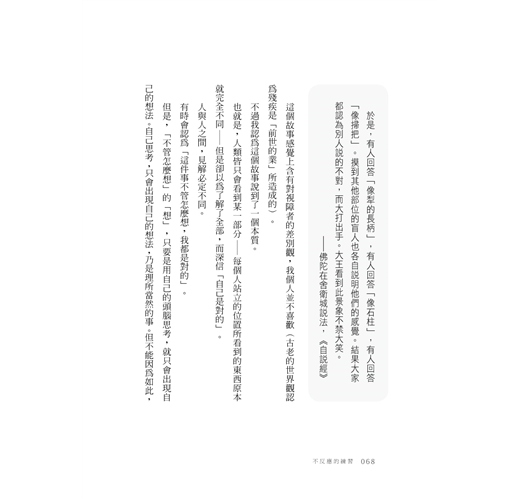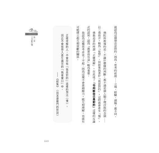 我曾讀過許多佛教書籍,大多數都因為無法理解書中的內容而中途放棄。本書用非常淺白易懂的方式來說明原始佛教經典,擷取佛陀語錄當中的「思考方式」,應用至現代人的日常煩惱當中。本書讓我們明白,原來佛教也可以這麼貼近一般人的世俗觀點,即使完全不懂佛教道理的人,也能一讀就通。雖然淺白易懂,內含的道理其實非常深奧,反覆多讀幾次就能明白佛陀的思考方式,尤其最後一章令我感動不已。
