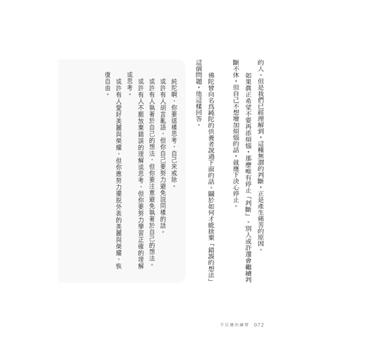 讀完本書之後,不必要的雜念和妄想都消失了,讓我每天都能感受到些許幸福。「不反應」並不是負面情緒,反而讓我們了解心靈平靜的本質。一旦改變心態,對周遭事物的感受就有180度的轉變,讀完之後讓我有種人生朝著不同方向前進的感覺!本書只教導我們將佛教的思想運用到思考人生之上,並沒有鼓吹讀者參加佛教活動,因此可以安心地閱讀。大力推薦本書!