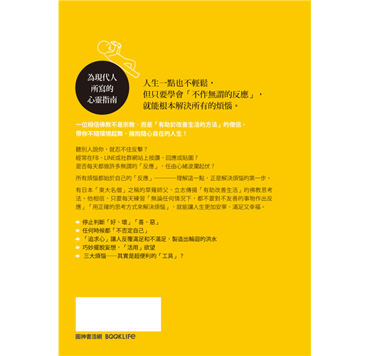 「本書改變了我的人生和生存之道,生活更輕鬆了!現代人所有的迷惘、煩惱、絕望的根源,都來自於過度的承認欲求和三毒(貪、怒、痴),放下無謂的反應,才能減輕人生的重擔。」