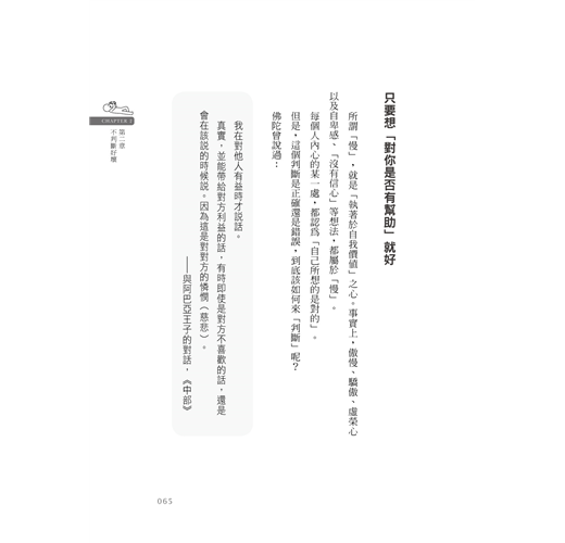 最好是「對自己、對他人,都不要下判斷」,因為這樣就可以將心放在其他的喜悅和滿足上,自己就會變得坦率而愉快。