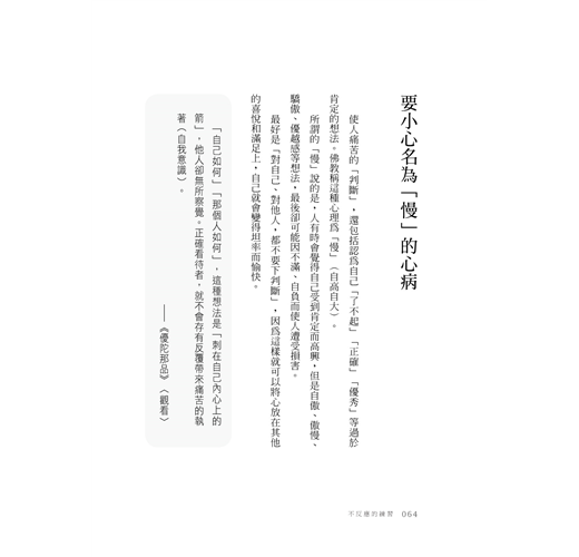 使人痛苦的「判斷」,還包括認為自己「了不起」「正確」「優秀」等過於肯定的想法。佛教稱這種心理為「慢」(自高自大)。