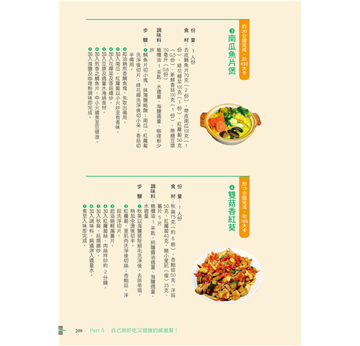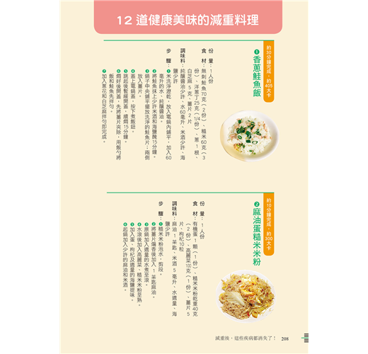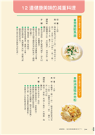 ◆12道營養師專門設計的健康料理:包括:香蔥鮭魚飯、甜椒炒透抽、麻油蛋糙米米粉、南瓜魚片煲、雙菇香紅葵、青蒜燒豆腐、牛蒡豆皮捲、塔香烘蛋、紅茄毛豆丁……等,自己做好吃又健康的減肥餐,為你的健康及減肥加油!