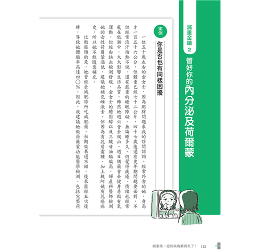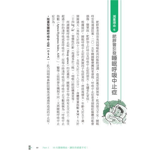 ◆10個減重好習慣,讓你徹底告別肥胖:減重是長期抗戰,除了找出真正肥胖的原因外,更需要養成能助你一臂之力的必勝好習慣,像是:控制主食熱量、撰寫飲食日記、戒掉3C產品、打造優質睡眠環境、做有氧運動、不輕易網路謠言……等,才能讓減重之路走向康莊大道。