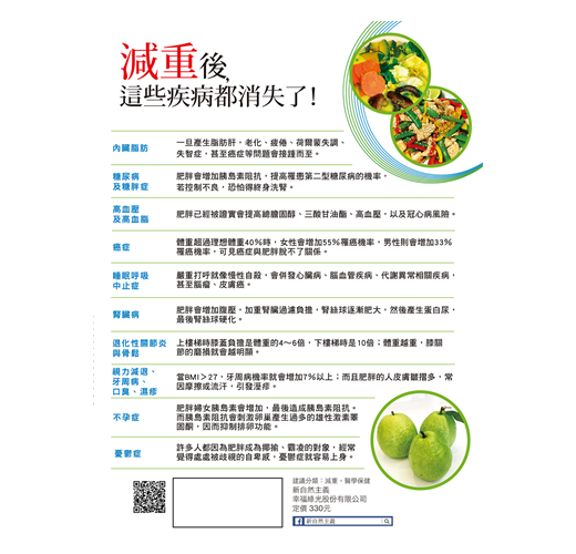 ◆10大健康理由,讓你非減重不可:你知道嗎?肥胖不只是美觀、自信的問題,肥胖還會引發脂肪肝、糖尿病、高血壓、腎臟病、牙周病、不孕症、憂鬱症、睡眠呼吸中止症、退化性關節炎與骨質疏鬆症,甚至癌症等慢性病及重大疾病!