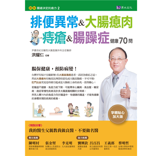 近期的食安風暴影響國人的健康至鉅,造成人心惶惶,以致大家透過各種管道,尤其是網路的社群網站、臉書、智慧型手機的LINE、WeChat等等,互相分享各種養生及保健之道,以求自保。但是,其中有許多似是而非的資訊,恐怕會誤導群眾,適得其反。基於端正視聽的社會責任,因此耀仁兄再次積極地籌畫這本《腸道決定抗癌力2──排便異常、大腸瘜肉、痔瘡、腸躁症健康66問》,希望大家能獲得更正確的醫學常識與胃腸保健知識。其關懷社會與悲天憫人的情懷,誠如法國大文豪雨果曾留下的名言:「我的理智讓我自覺渺小,我的良心讓我無所畏懼。」