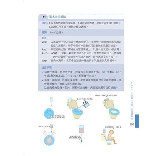 ■一天多次溫水坐浴,每次五至十分鐘,可改善局部脹痛。