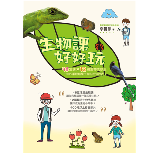 這一年,我嘗試將這些課程內容寫成書與更多人分享。由於希望提升孩子們的閱讀力,也希望為青少年打好生物學的基礎,才有能力讀懂更多的科普書籍,所以書中字數與內容都比課本要多。老實說,對於十歲出頭的孩子而言這本書並不那麼淺顯易懂。我希望孩子不是孤單地閱讀,而是與家長或老師一起共讀,大人也藉機複習一下遺忘許久的生物課,將分離的生活、生命與大自然從新連結。讓這本書成為一個啟動因子,打開人與自然的藩籬,每逢假日或考後,親子或師生們共同找出一段空閒,走向戶外,把腳步放慢,試著觀察周遭的生物,輕輕碰觸,靜靜嗅聞,閉目聆聽,把自己的五官及心靈開放於大自然中。你一定可以感受到大自然正在與你說著什麼,你也會很自然地在內心回應著它,那將會是你生命中非常難忘的體驗。
