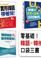 《零基礎!韓語.韓檢口袋三書》,從發音、單字、句型、動詞、一直到韓檢,不但引領你踏出學習韓語的第一步,還要你成為韓語聽、說、讀、寫的高手!就讓《實用韓語帶著背!》、《韓國人天天都會用的500動詞》、《韓語檢定初級單字帶著背!》口袋三書,幫助你輕鬆學習韓語吧!