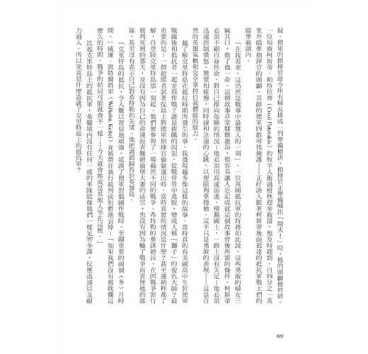 名人推薦:〔來自國外專業書評的絕讚好評〕 「書中的文字展現出對於體能耐力的熱切關注……麥杜格重新定義了英雄氣概理想中的樣貌,將英雄氣概定義為一系列的技能而不是一項美德……並且帶領讀者了解成為英雄的技藝……書中的故事主軸十分精彩,綁架過程高潮迭起、引人入勝,麥杜格以新聞紀實的敘事法帶領我們進入英雄的世界。追尋「重新釋放心靈中的野性」這件事和戰爭故事似乎是個怪異的組合,但是在麥杜格功力深厚的文筆下,這樣的組合卻怪異地成為絕配,就像在充斥著納粹軍隊的島上綁架一位德國將軍這件事一樣。」 ──美國國家公...