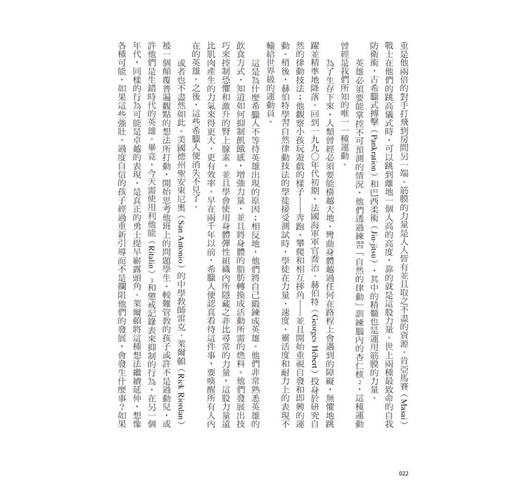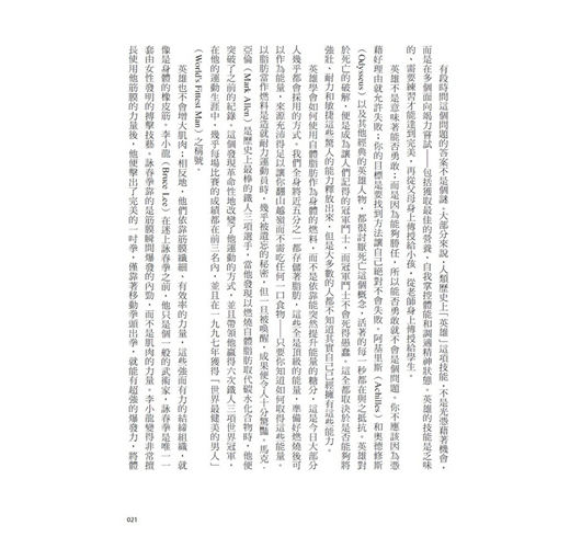 ◆英雄是世界上最幸福的人 ──徐國峰(運動作家) 「人之異於禽獸,幾悉!」(《孟子.離婁篇》) 兩千多年前的孟子早認清了人是一種動物而且「與動物之間差別很小」的事實,有多小呢?生物學家很明確地告訴我們答案。在基因組上,我們與世界上另外兩種黑猩猩只有「1.6%」的差異,遺傳差異可以反映演化時間,因此演化學家估算出人類祖先從人--猿共祖分化出來的時間大約是在七百萬年前。美國普立茲獎與英國科普書獎得主賈德.戴蒙(Jared Diamond)更以人類是《第三種黑猩猩》(The Third Chimpanzee)為主題探討人性。 人性裡頭包含了動物性,這也是麥杜格的前一本書《天生就會跑》的主題。他從超馬、赤足跑者的故事與演化學證據來強調我們不該摒棄自己天生的動物性,而是該擁抱它,從中體驗本性的美好。 麥杜格這本新作《天生是英雄》則在探討人性裡頭很不符合物種演化邏輯的主題──「英雄」。作者所要探討的問題是:英雄寧願犧牲自己也不願意背叛他的同伴,這種人通常都沒辦法留下後代來繼承他高貴的天性。但如果物競天擇的過程會消除天生的英雄氣概,為什麼英雄仍然持續存在人類的世界裡? 這次,麥杜格試著從人性的角度切入,輔以人類各種驚人的運動能力來說明人跟禽獸的些微的差距正是英雄得以不斷重生的原因。 透過書中的英雄事蹟,麥杜格引領我發掘人體各種美妙的潛能,以及逐步摸索「英雄是如何成形的?英雄是天生的嗎?還是後天學習來的?」這些問題。因為書中的故事實在太有趣了,使我覺得摸索的過程並不無聊,反而很享受跟著作者一起找答案的樂趣。 英雄為什麼要當英雄,只是能力愈強,責任愈大嗎?從作者歸納出來成為英雄的三根支柱──同情心、力量與技巧,就可以了解答案其實剛好相反。人類是社會的動物,所以具有保護他者的同情心,能對同類形成責任感,為了擔起責任所以潛能才因此被激發。透過本書,我更加確信:你我天生就具有強壯、耐力和敏捷這些驚人的能力,但技巧卻是後天學習與訓練出來的,而且正因為英雄選擇把這些能力奉獻到他人身上,所以他們才會在危難時產生驚人的勇氣。就像書中提到諾麗娜為了保護學生,不顧自身安危抱住手持開山刀的暴徒。最後在法庭上,手指被斬斷兩根的諾麗娜對著傷害她和學生的犯人說:「我用雙手抱住你,讓你得到平靜。」史坦兩眼直瞪著她,默默地從嘴裡喃喃說出:「謝謝妳」。 接納自我與貢獻他人是德國著名心理學家阿德勒認為獲得幸福的重要元素。在成為英雄這過程中,就如同阿德勒的論點:我們會因為「貢獻感」而獲得幸福。因此,若以目的論來說,英雄,是為了獲得幸福而奉獻,而他們奉獻的精神不會隨著肉體死亡而消失,它會透過語言與文化流傳下去,就像這本書裡的故事將隨著作者的文筆也留在你的心中一樣。 希望你也能從書中這些英雄的故事與開發潛能的過程中獲得啟發,開始用運動喚醒自己身體裡的英雄本色。這讓我想起跑步哲人席翰醫生所說:「跑者本身既是主角、又是對手,也是觀眾。一旦行動成功,唯一的觀眾便獲得滿足,而英雄,就是『做自己』的堅決意志。」你我都可立即開始踏上英雄之路,那也是一條提起勇氣追求幸福的新道路。 ◆體能、耐力與熱情是一個人轉換成一個英雄的諸多來源 ──鄭匡寓(動一動運動媒體總編輯) 一切沒有必定的偶然。 早前科學雜誌對人類進化與退化的辯證,早期的人類能跑能跳、能一日間穿越山頭而不感疲憊;現代的人卻連半程馬拉松、甚至是十公里的步行都無法順利完成。最後科學雜誌的結論並不讓人意外:體能趨向逐漸退化,但人類的智能只有少部分的進化。唯一的解釋是智慧讓生活越來越輕鬆,不需要付出太多體能與面對求生掙扎而產生的意志力。簡單地說,如果能用一根手指頭看書〈電子書〉,誰還需要用一整隻手翻書呢? 但克里斯多福.麥杜格告訴你,你要多一些動作,哪怕是翻書。而這一切的付出都是有所幫助的。人活著就是要多動,包含腦袋。 完成《天生就會跑》離開了墨西哥銅峽谷之後,麥杜格前往希臘克里特島找尋孕育戰爭英雄的答案。追尋希臘奧林帕斯眾神的腳步,他書寫下如DNA雙股螺旋鍊的故事,孕育英雄的吉光片羽以及戰時一群雜牌軍在此轟轟烈烈進行游擊作戰。過程中諸多線索一再地顯示體能、耐力與熱情是一個人轉換成一個英雄的諸多來源。沒有一個英雄是自己稱呼的,所有的英雄稱號都來自於他人的給予與符號添加。 書中有許多部分非常值得運動、健身的人士們參考,包含流行已有時日的「跑酷」運動、開發潛能、利用大自然作為訓練的場所,使用肌肉與筋膜的論調,飲食上不同過往的理論辯證:碳水化合物從耐力運動員的居家良伴變成了肥胖元凶?書中還提到了菲爾‧馬佛東這位曾在耐力運動界引起話題旋風的運動教練,不只讓更多人認識這位古怪教練,也將間接把這位頂尖教練的訓練思維帶入台灣。 上一本《天生就會跑》麥杜格帶來了赤腳跑步風潮。而這一本《天生是英雄》他即將為我們帶來更多思維,追尋他筆下的每一個角色,讓我們找到成就典範的點滴。