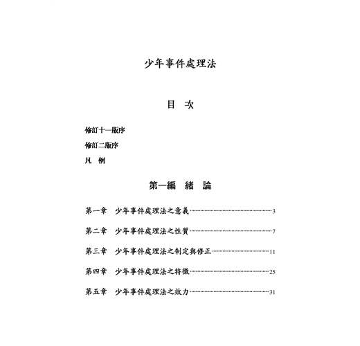 承三民書局法律編輯陳小姐來電告知本書即將再版,心甚欣慰,茲值修訂十一版少年事件處理法一書即將再版之際,謹匆匆撰此序文,敬請國內學者、讀者、專家以及購閱者,不吝指正,爰為之序。