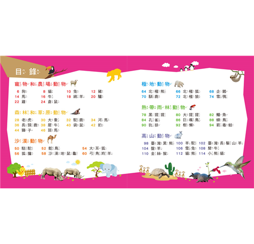 透過六主題(寵物和農場、森林、沙漠、極地、熱帶雨林、高山動物)分類認識,每個主題前還有簡單說明,有組織了解動物間的基本差異。