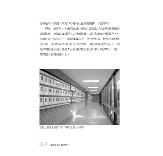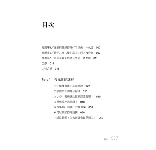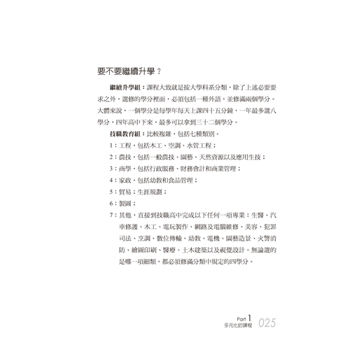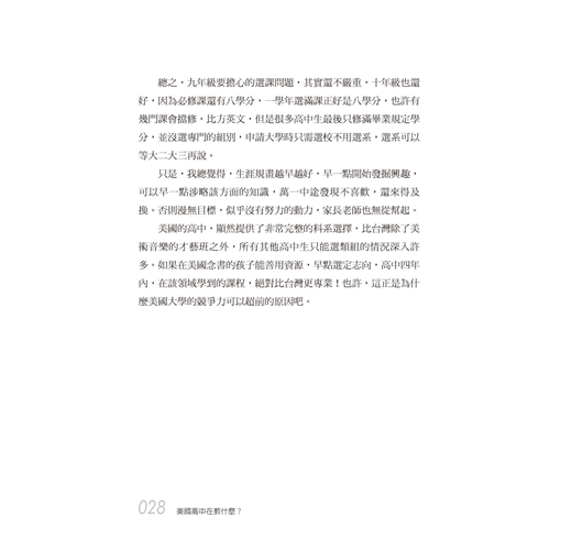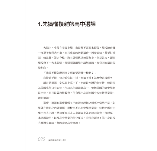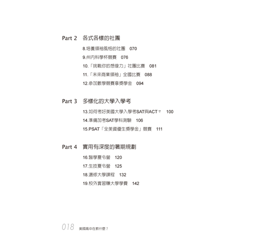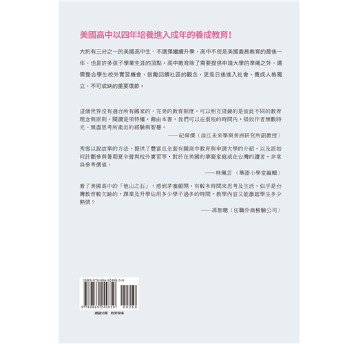 1.本書提供了豐富且全面有關美國高中教育與申請大學的介紹,例如該如何選課,選社團,如何培養實力準備大學考試,有哪些獎學金申請的管道,以及該如何計劃參與暑期夏令營與校外實習等,對於在美國的華裔家庭或有志到美國留學的學子,是非常實用的資訊,而對於在台灣的讀者,這也是非常具參考價值,協助中學時期的孩子準備未來的全面性的介紹。