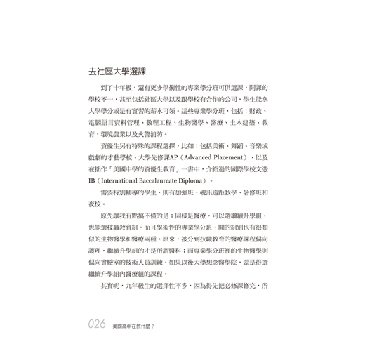 資優生另有特殊的課程選擇,比如:包括美術、舞蹈、音樂或戲劇的才藝學校、大學先修課AP(Advanced Placement)、以及在拙作「美國中學的資優生教育」一書中,介紹過的國際學校文憑IB(International Baccalaureate Diploma)。