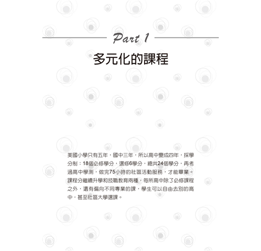 名人推薦:這個世界沒有適合所有國家的,完美的教育制度,可以相互借鏡的是彼此不同的教育理念與原則。閱讀是項特權,藉由本書,我們可以在很短的時間內,吸收作者無數時光、無盡思考所產出的經驗與智慧。
