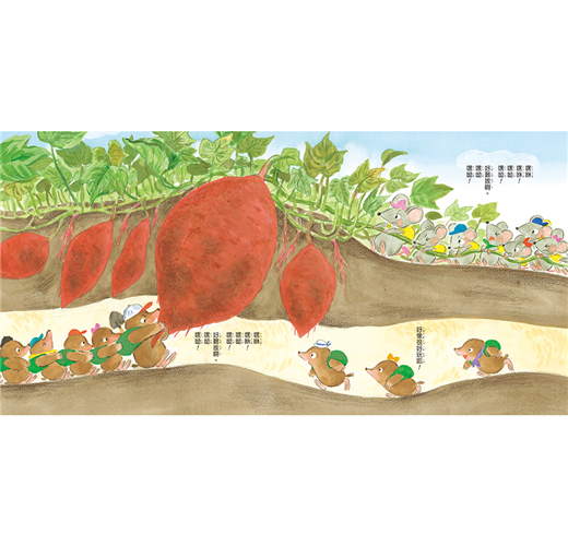 畫面中充滿了很多好玩的事, 看老鼠踩著樹的鬍鬚玩盪鞦韆,鼴鼠避開蜘蛛結網的通道,以及大家找到大番薯時開心的模樣。