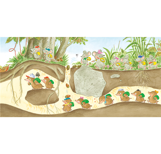 今天的天氣非常好,老鼠幼兒園的小朋友,背上背包,一個接著一個,出發去遠足囉!同一時間,住在地下的鼴鼠幼兒園也出發了!