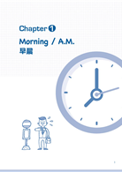 Chapter 1 早晨 Morning / A.M 醒來、起床/鬧鐘/起床SOS求助句/起床時間/不想起床/睡眠不足 /睡眠充足/睡墊與床/開窗/空調 廁所/廁所SOS求助句/洗手/洗手SOS求助句/洗手台/在洗手間/刷牙/淋浴/漱口/洗臉/頭髮/整理髮型/化妝/眼妝/唇妝/化妝好用句/指甲狀態/穿衣 早餐時間/咖啡/吐司/三明治/雞蛋料理/食慾 讀早報/經濟/社會/天氣預報/溫度/其他好用句 One Point Lesson: Wake up與Get up One Point Lesson: Give me a Break!