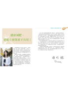 從事營養保健工作已將近10個年頭,一直透過演講、諮詢、部落格、報章雜誌專欄……等管道,告知讀者「預防保健」的重要性,並希望能從日常生活與飲食的基本教育,來引導民眾重視營養保健與預防疾病,不要等到疾病發生才尋求醫師治療與改善,通常為時已晚。
