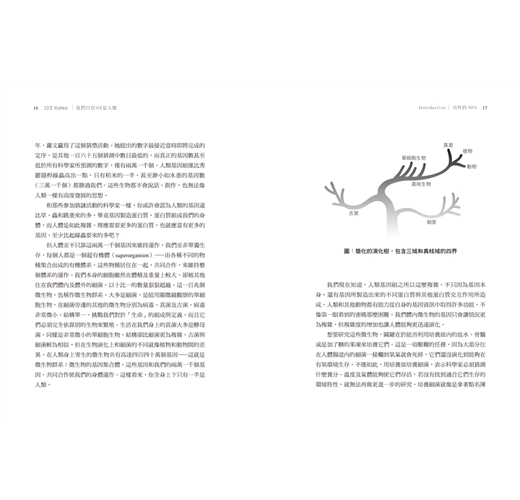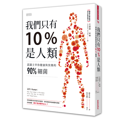 近來流行一個說法,也就是這本書的書名所指稱的,「我們不過只有10%是人類」。這裡的百分之十是針對我們全身上下裡外所有細胞數量而言,因為我們無論是在皮膚上還是毛髮、腺體或腸道,都住了許許多多看不見的微生物,它們的細胞數估計有我們人體細胞的近十倍之多!
