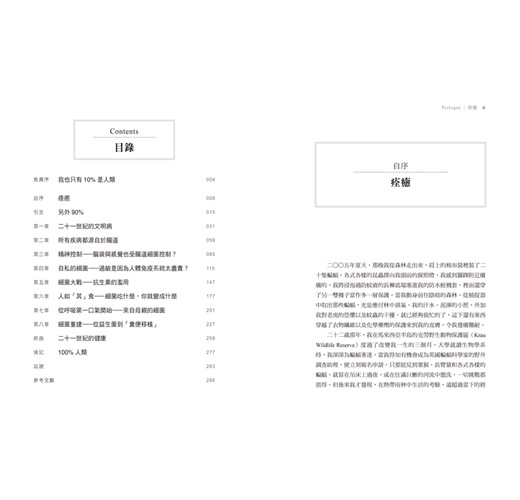 我的健康問題只是冰山一角。透過新興科學的證據可得知,人體內細菌的崩壞會造成消化不良、過敏、自我免疫疾病、肥胖症,甚至從焦慮、憂鬱到強迫症、自閉症。不只身體健康會被影響,精神健康也會。這樣看來,許多生活中早已習以為常的疾病並非由基因缺陷所引起,也不是我們的身體讓我們失望了,而是因為我們疏於珍惜我們身上另外百分之九十的細胞:細菌。