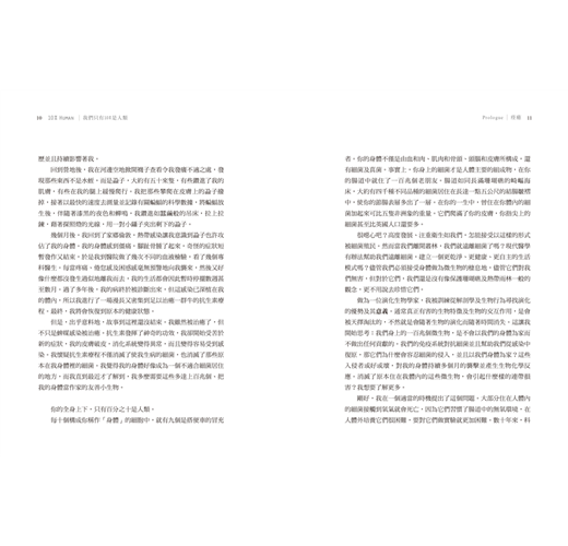 每十個構成你稱作「身體」的細胞中,就有九個是搭便車的冒充者。你的身體不僅是由血和肉、肌肉和骨頭、頭腦和皮膚所構成,還有細菌及真菌。事實上,你身上的細菌才是人體主要的組成物,在你的腸道中就住了一百兆個老朋友。腸道如同長滿珊瑚礁的崎嶇海床,大約有四千種不同品種的細菌居住在長達一點五公尺的結腸皺褶中,使你的節腸表層多出了一層。在你的一生中,曾住在你體內的細菌加起來可比五隻非洲象的重量。它們爬滿了你的皮膚,你指尖上的細菌甚至比英國人口還要多。