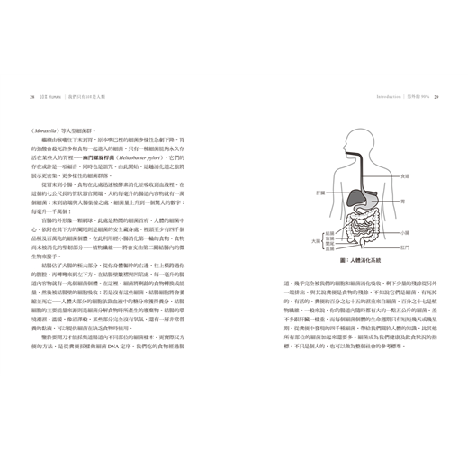 作者以其演化生物學的專業為基礎,研究細菌與人類自古以來的共生關係。我們體內的微生物群就像一個看不見、被遺忘的器官,不僅能輔助消化,還會幫忙調教免疫系統,對維持人體機能的運作功不可沒。它們的基因也是我們的基因的一部分,只不過它們演化的速度比我們更快,足以順應人體的需求做出調整。然而人類生活方式的改變卻破壞了體內「微生物生態系統」的平衡,例如抗生素雖然可以救命,但也會殺死對我們有益的細菌;現代人高脂、高糖、低纖維的飲食習慣,讓體內的「肥胖」細菌和「纖瘦」細菌比例失衡,進而引發腸道疾病,增加身體組織發炎的機率;剖腹產和配方奶粉的盛行,剝奪了新生兒從母親身上接收益菌的機會,甚至提高了感染壞菌的風險。